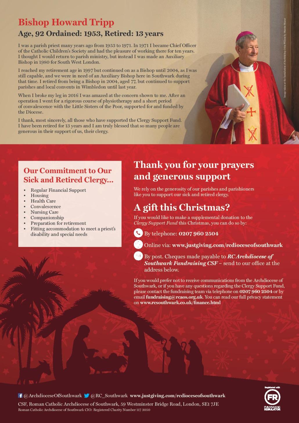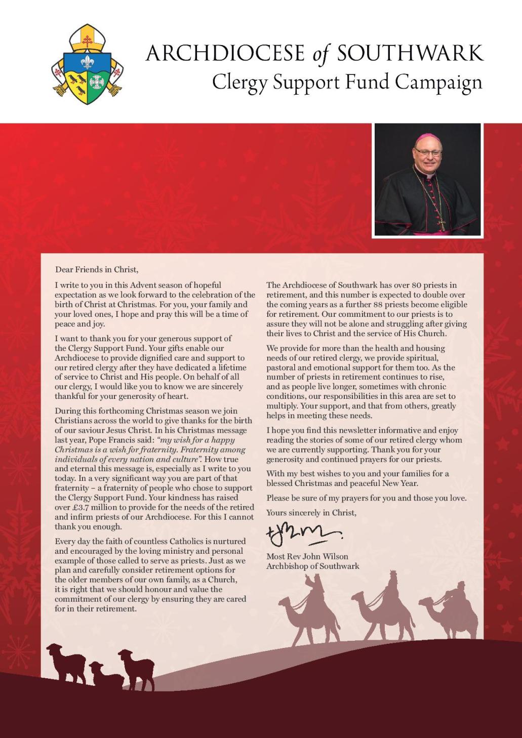The Archdiocese Finance Office writes: The campaign raised £3.7 million from 3,000 gifts and pledges, all in support of the elderly and infirm priests of Southwark who have dedicated their lives to the Church. It was a great display of generosity for which we are incredibly grateful. We want to thank you too, our parish priests, for having supported the campaign in your parishes and enabling people to learn about, and support, the welfare of our clergy in their retirement.