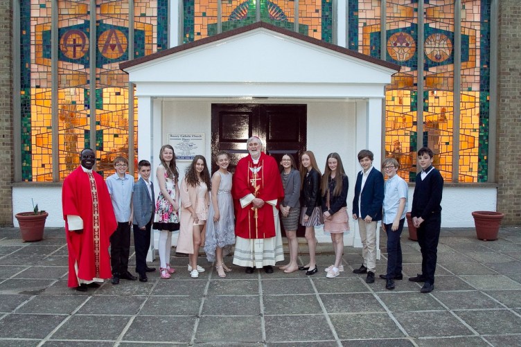 Bishop Pat Lynch, who has pastoral responsibility for the South East area of the Archdiocese of Southwark, confirmed the young people, shown here with Fr Gregory (photo Andrew Dunsmore).