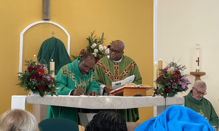 Fr Mark signs the Profession of Faith as Canon Victor looks on