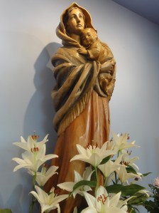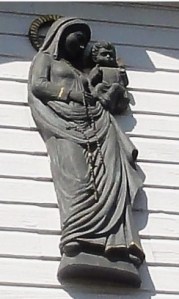 The distinctive sculpture of Our Lady of the Rosary high up on the facade of the church is by the Benedictine nun Mother Concordia of Minster Abbey in Kent (Concordia Scott, 1924-2014), who made many sculptures for churches. A parishioner commissioned the statue as a gift to the parish.