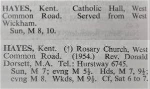 In November 1954 a multi-purpose hall, Rosary Hall, opened. Two years later Hayes officially became a mission and the hall was converted into the Church of Our Lady of the Rosary, which opened on 15 November 1956. However, in the first years the hall was still used for badminton and dances, as well as to hold Mass. In the early 1960s the decision was taken to turn the hall solely into a church.